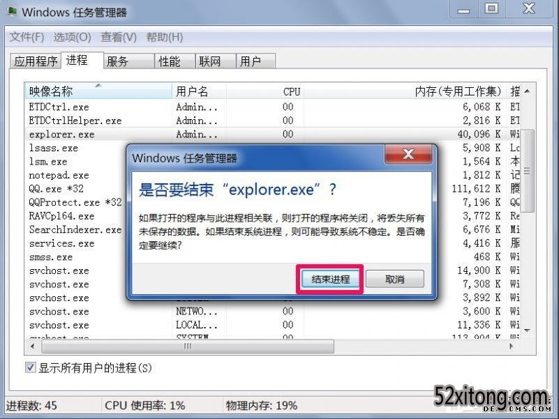 1、先在任务栏右键,或同时按Ctrl+Alt+Del键调出任务管理器,选中“进程”选项卡,在进程列表中,找到Explorer.exe这个进程,右键,将其结束,会跳出确认框,按“结束进程”;