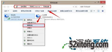 1、打开控制面板的网络和internet,点击网络连接的wlan,右键选择状态。