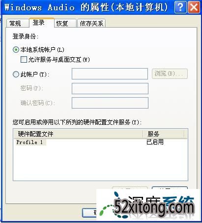 2、或者将windows audio的登录选项,设置为本地系统帐户即可