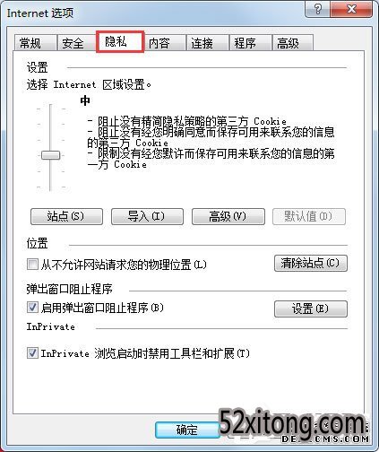 3、点击Internet选项设置窗口以后,打开里面的“隐私”选项;
